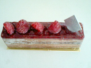 ラスト。 ラズベリーは大好物なので喜んでいたんですが、よく見ればこれもチョコケーキ(_ _;) これまでの2つがかなーり甘くて、しかも1つ目のがかなりどっしりずっしりしていたものですから(同サイズのおはぎくらいの重さです)、実はちょっと食傷気味。 でも先の2つと違って苦いチョコだったので一安心…って、ラズベリーと合わなっ!?